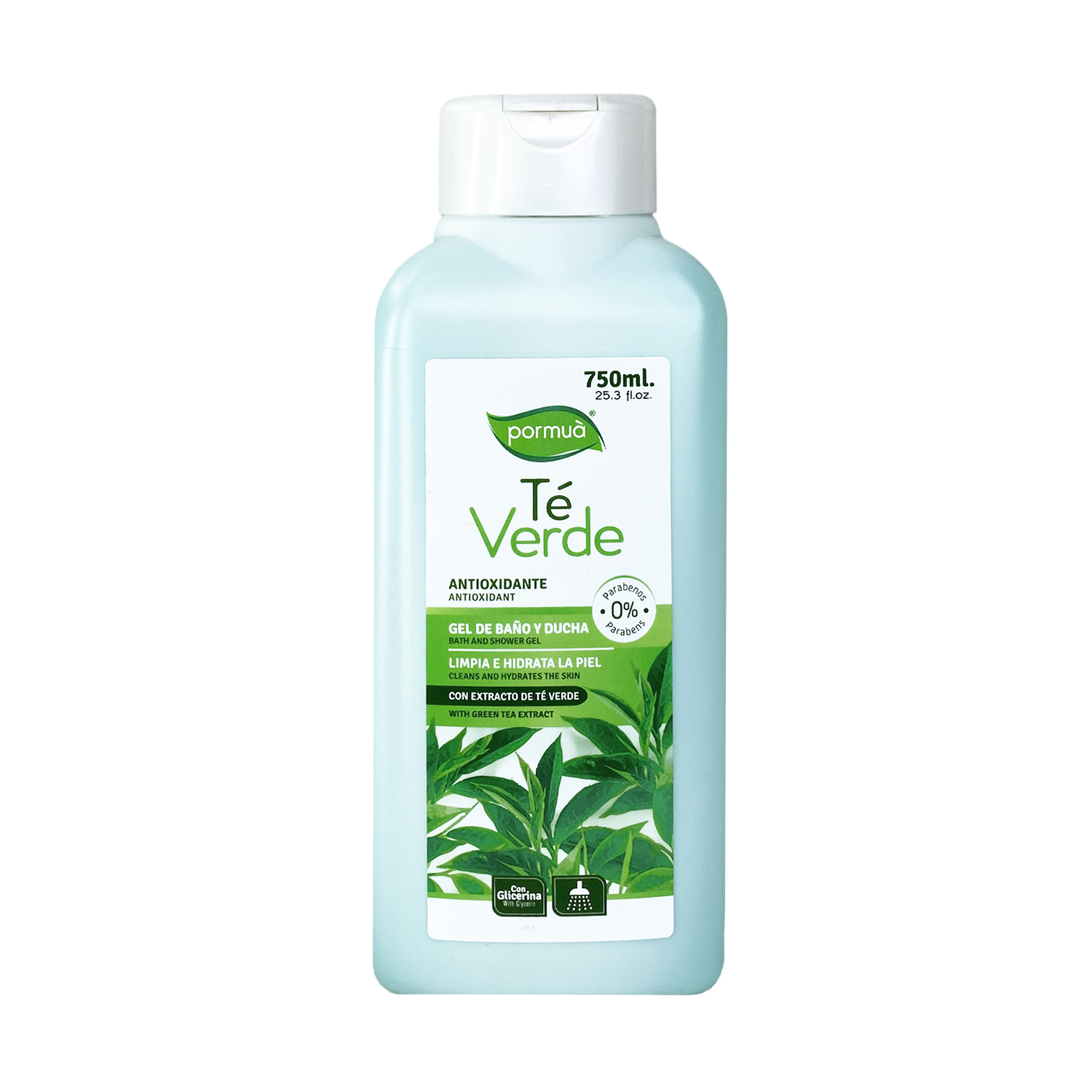 750 ml. Gel de duchaTe verde, posee un alto poder antioxidante que protege la piel de los radicales libres. Su fórmula con extracto de té verde y glicerina proporciona hidratación, dejando la piel suave y con un agradable aroma.