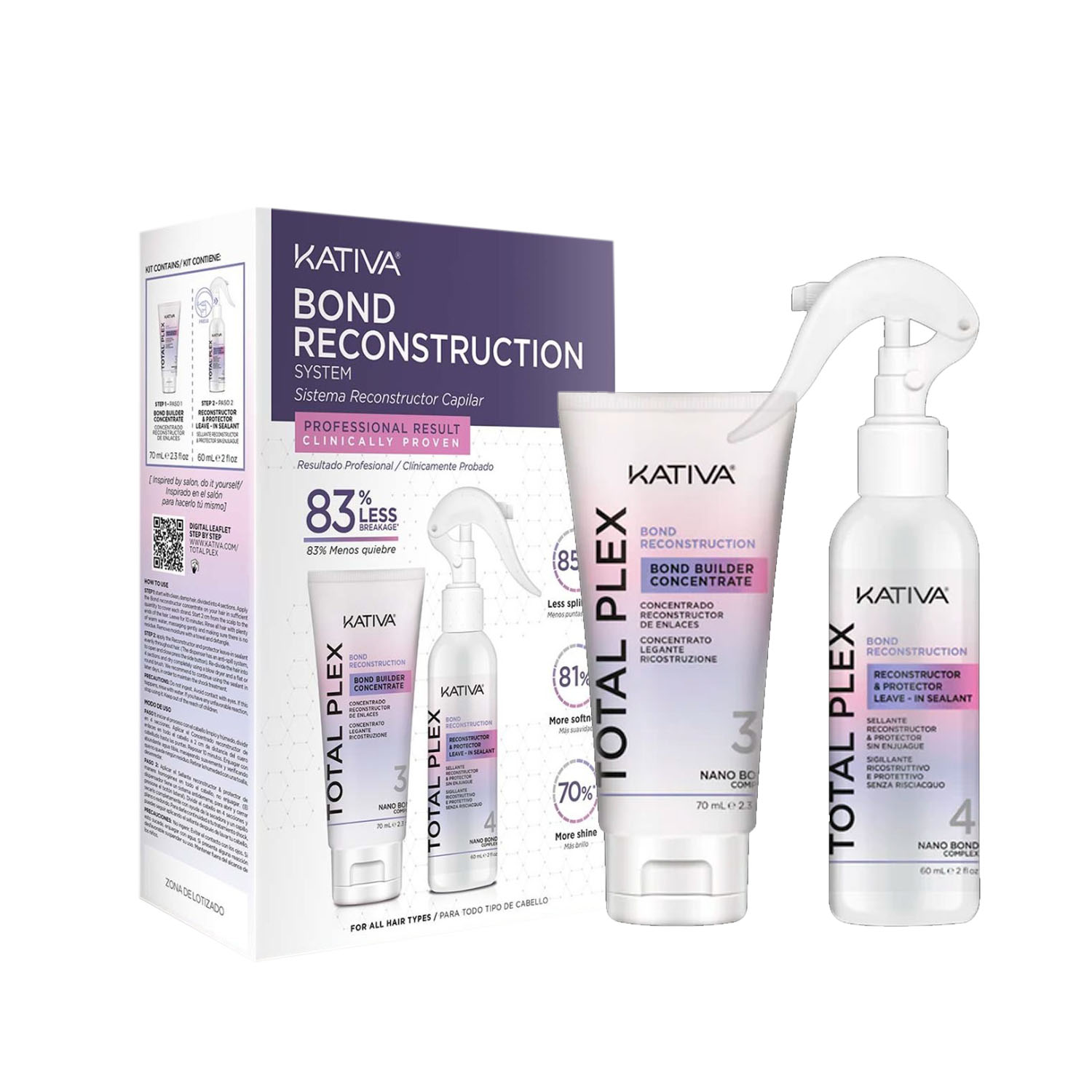 Total plex es un sistema de dos pasos con poderosas fórmulas que reconstruyen los enlaces de queratina y revierten los daños del cabello.
