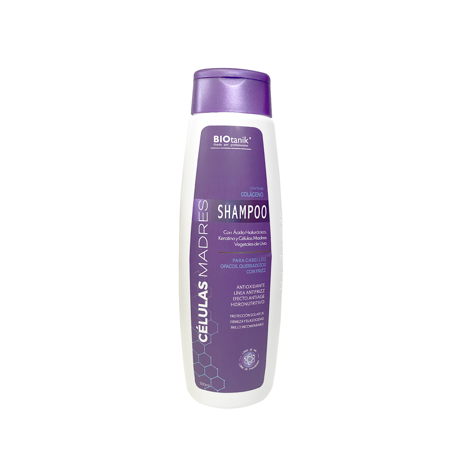 500ml. La nueva línea Células Madres de Biotanik presenta su Shampoo desarrollado con Células Madres extraídas de la Uva y una majestuosa combinación de ingredientes activos regeneradores como el Acido Hialurónico, Colágeno y Keratina que transforman inmediatamente el cabello deshidratado reconstruyendo la hebra desde la raiz devolviéndole así la vitalidad, resistencia y elasticidad a la fibra capilar.