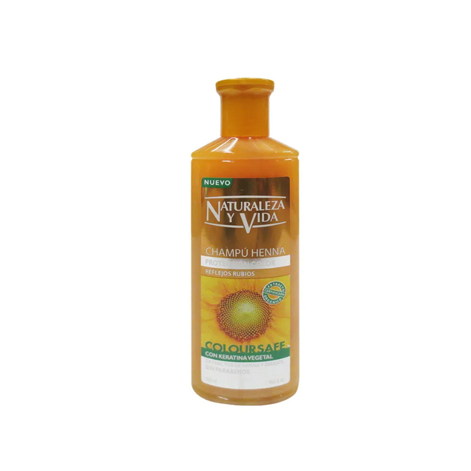 300 ml. Nueva fórmula de triple acción, con extracto 100% natural de Semilla de Girasol, Aloe Vera, Henna y Keratina Vegetal para cabellos naturales o teñidos.