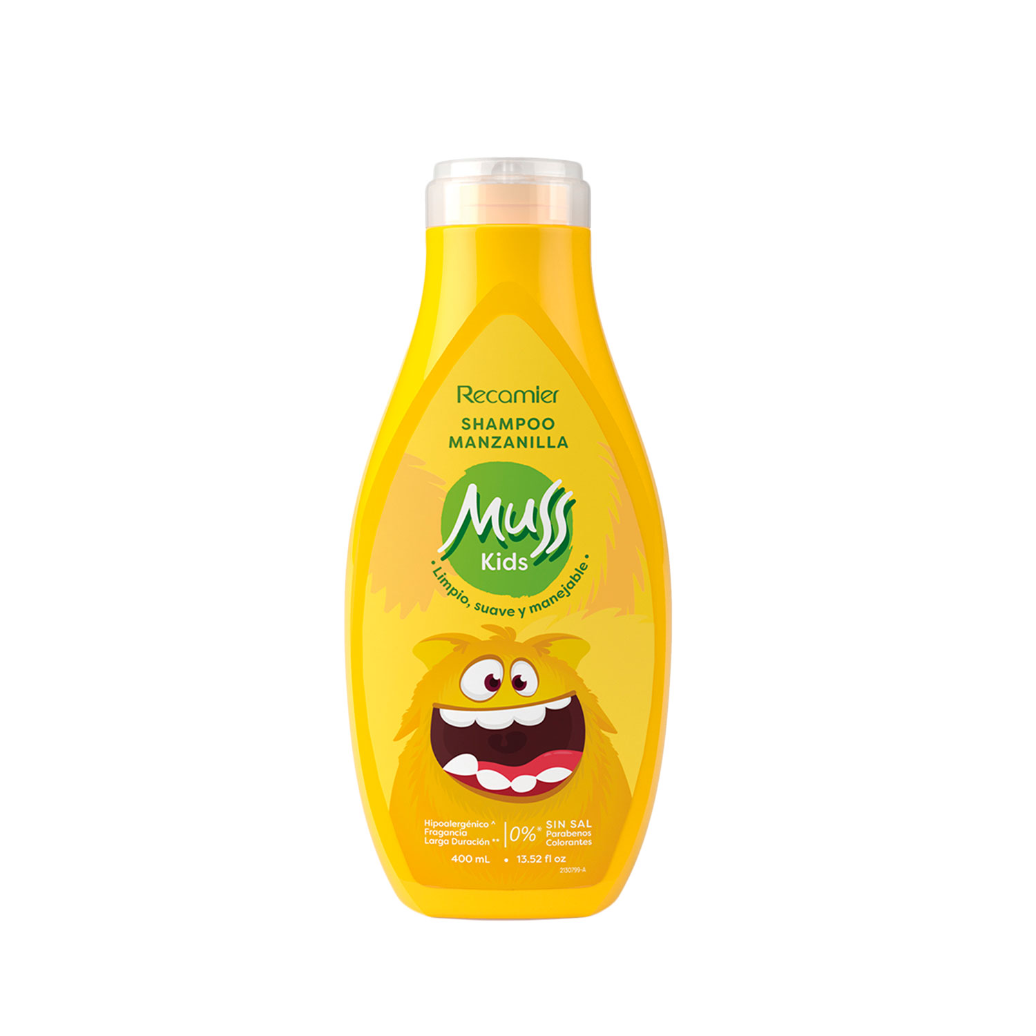400 ml. El Shampoo Muss Kids Manzanilla fragancia larga duracion, es una formula suave, sin adicion de sal (Cloruro de Sodio), colorantes y parabenos, desarrollada especialmente para limpiar suavemente el cabello rubio de los niños y niñas, testeada dermatologicamente para proteger la piel y el delicado cuero cabelludo brindando una limpieza suave y segura.