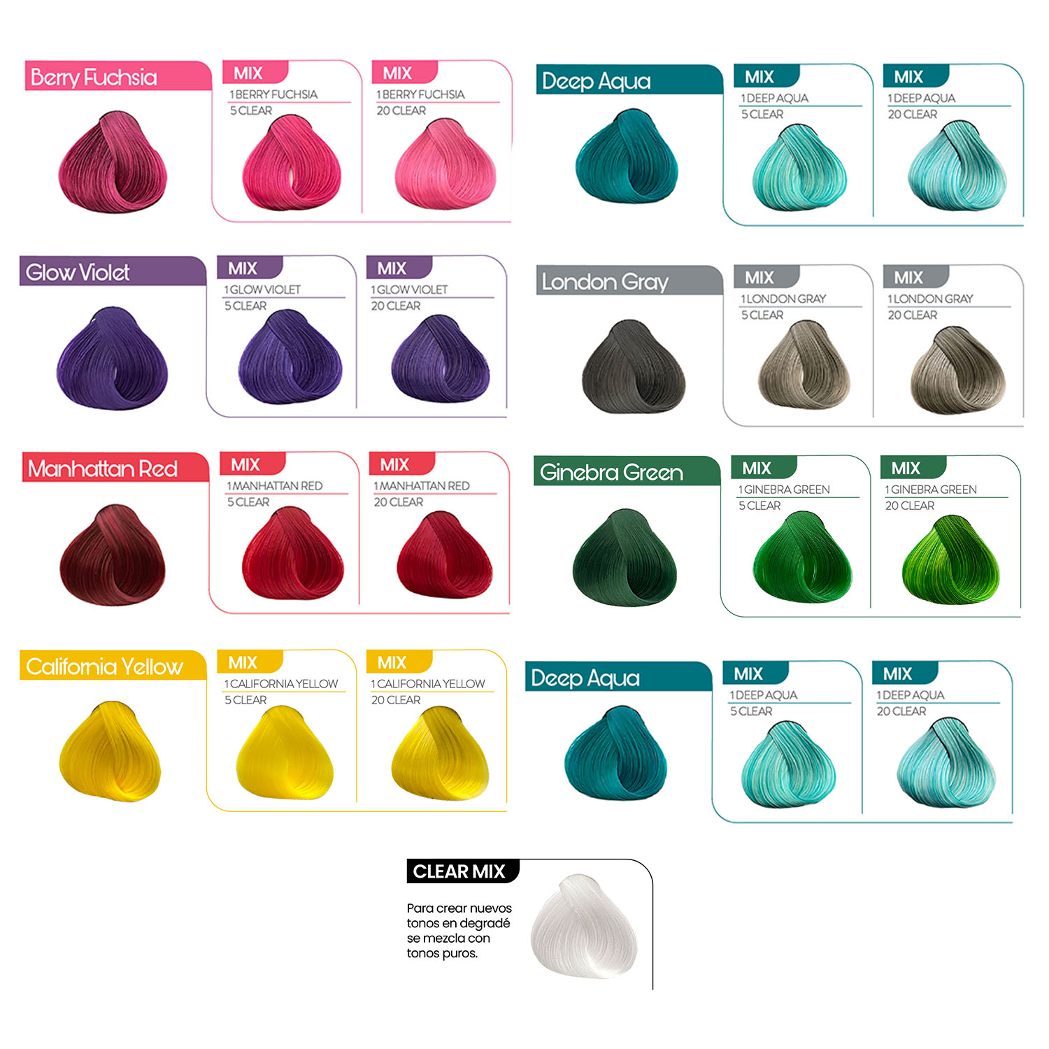 Consta de 8 tonos concentrados y un clear mix que pueden ser mezclados entre sí para obtener tonos pastel o degradados. Uso exclusivo profesional para crear looks originales y personalizados.